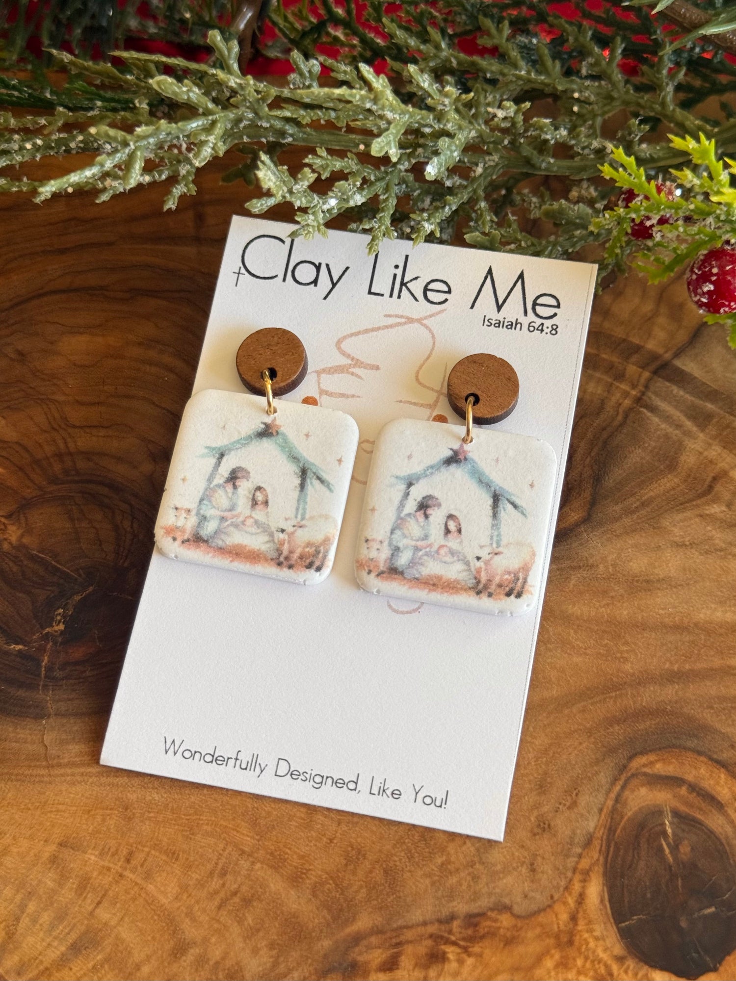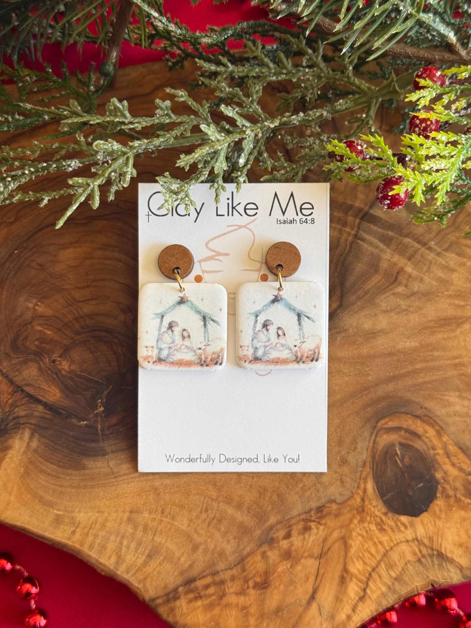 Celebrate the true meaning of the season with these beautiful Nativity earrings. Each pair features a delicate scene of the Holy Family, lovingly detailed in soft white polymer clay to capture the serenity and grace of that first Christmas night.