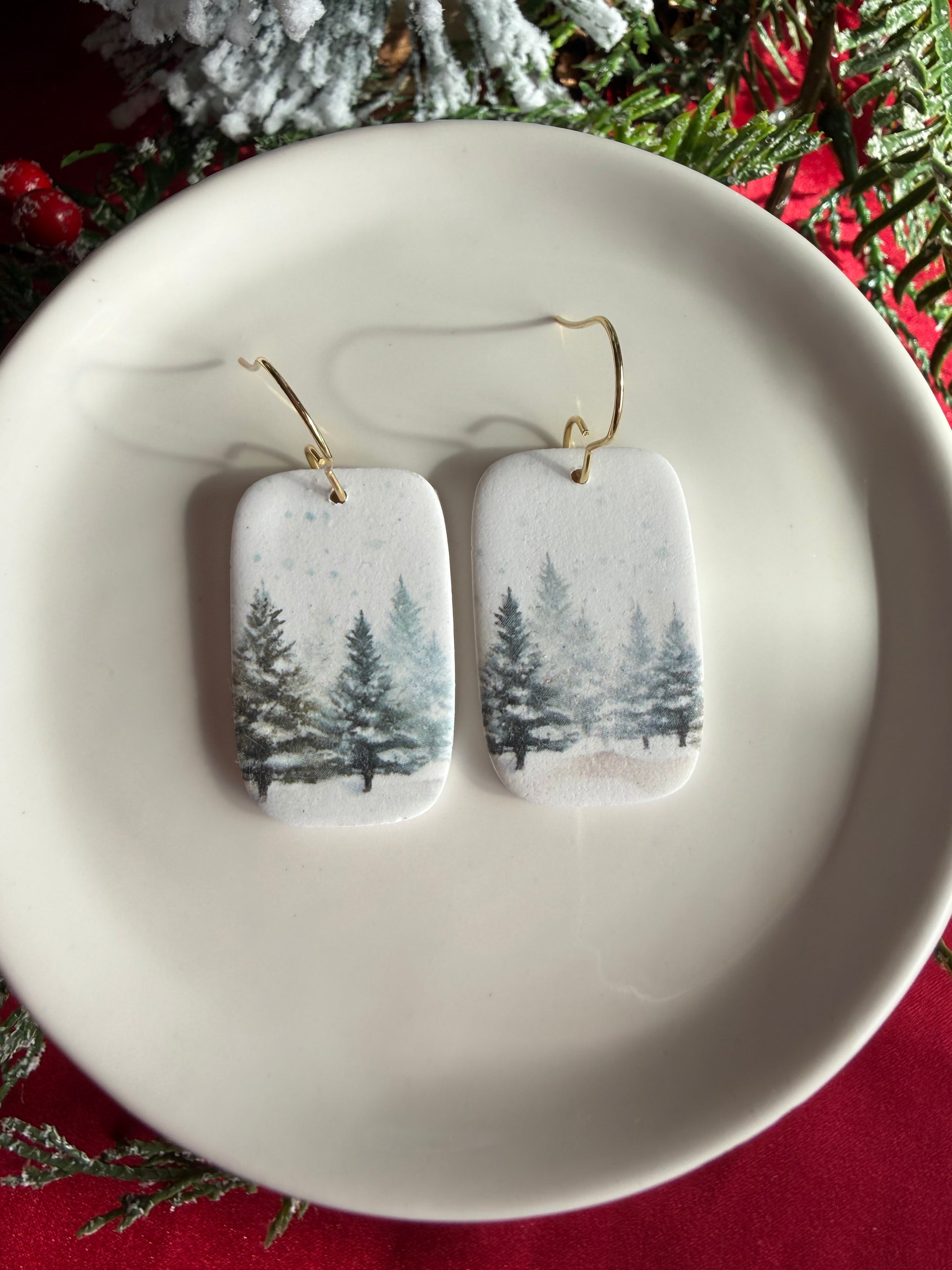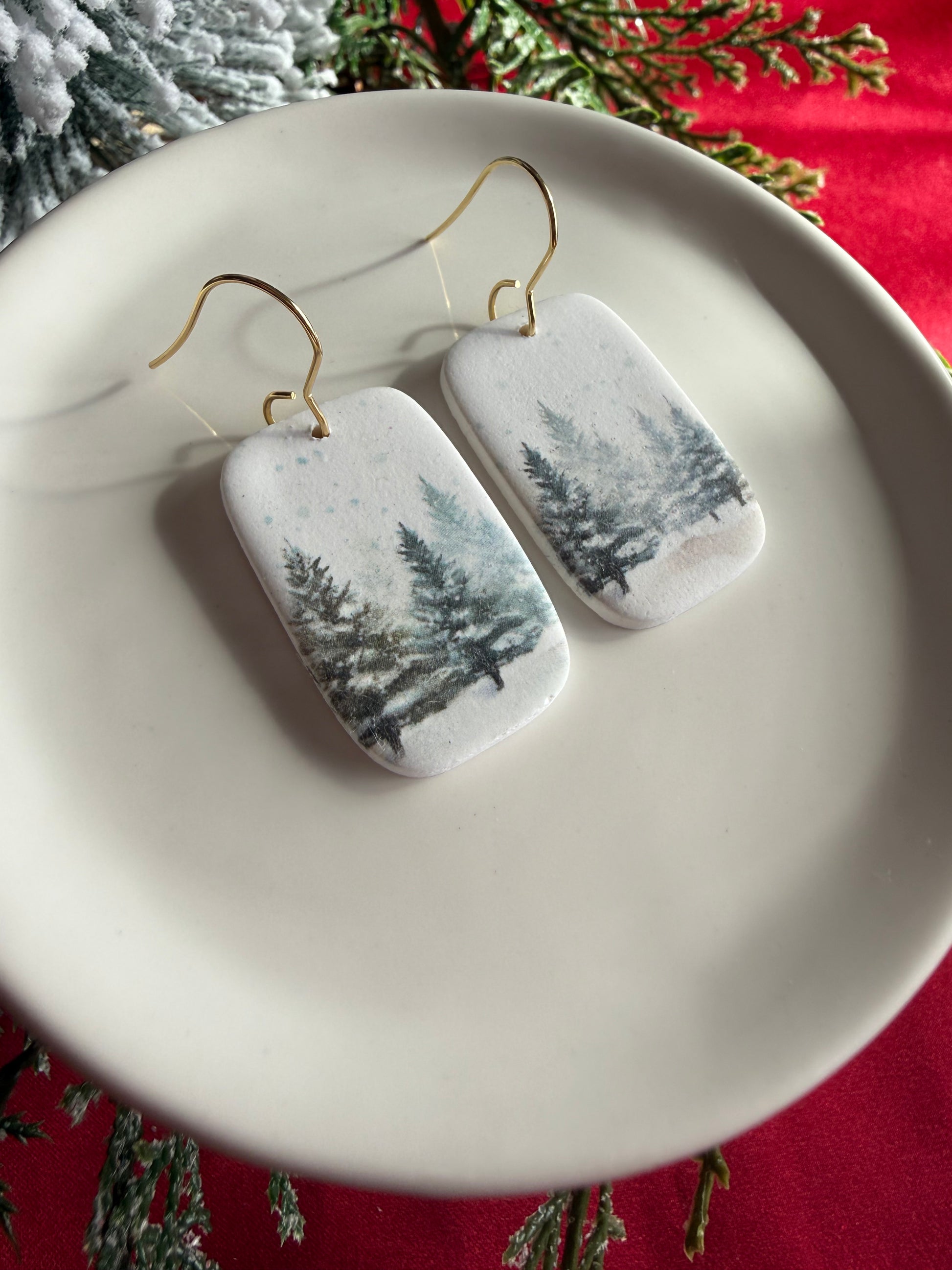 Step into a peaceful winter scene with this serene forest design. Each pair captures the quiet beauty of snow-dusted evergreens. A gentle reminder to pause, breathe, and find stillness in the season. Paired with a warm wooden accent ring that adds a natural, earthy touch.