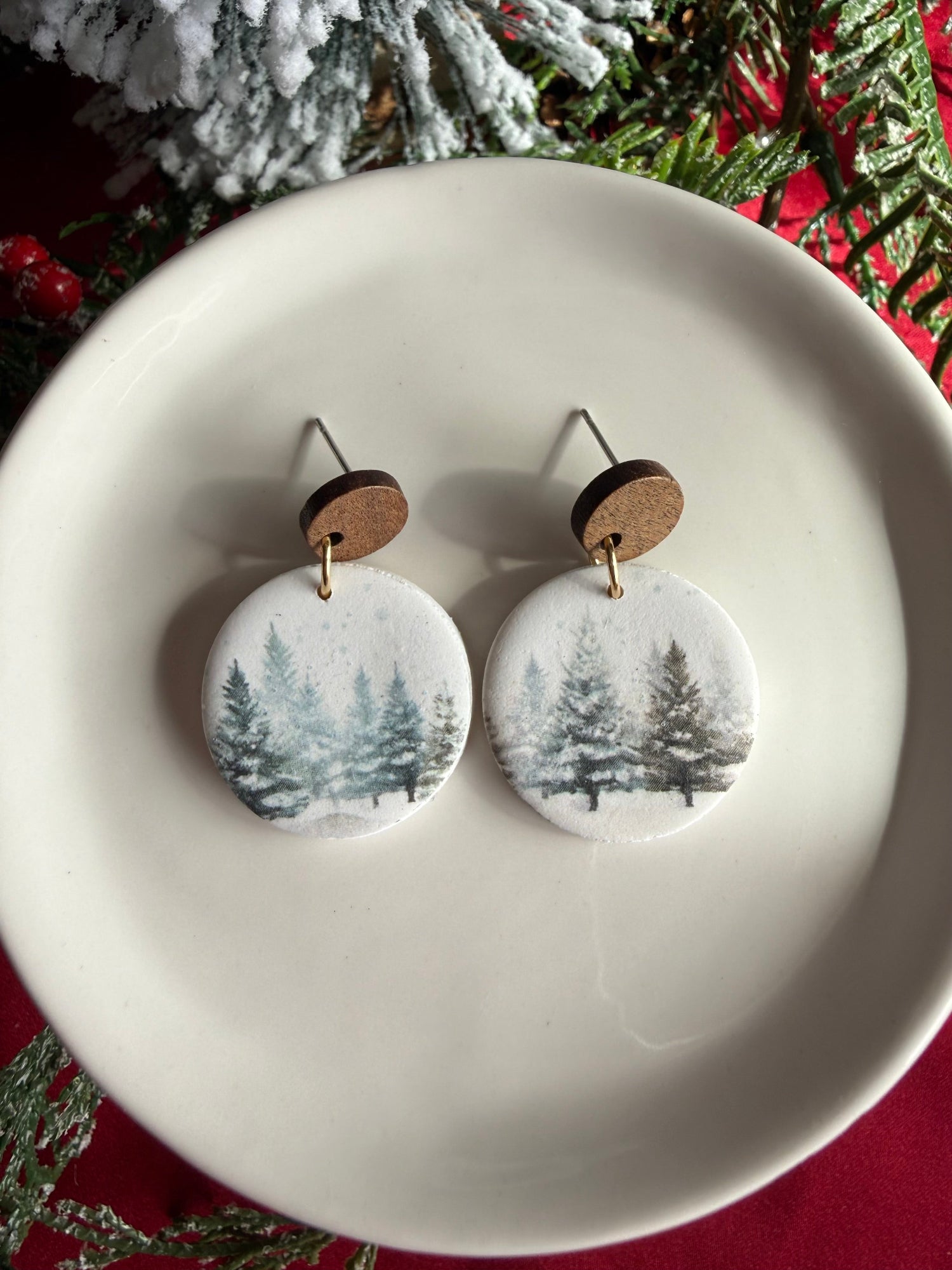 Step into a peaceful winter scene with this serene petite forest design. Each pair captures the quiet beauty of snow-dusted evergreens. A gentle reminder to pause, breathe, and find stillness in the season. Paired with a warm wooden accent stud that adds a natural, earthy touch.