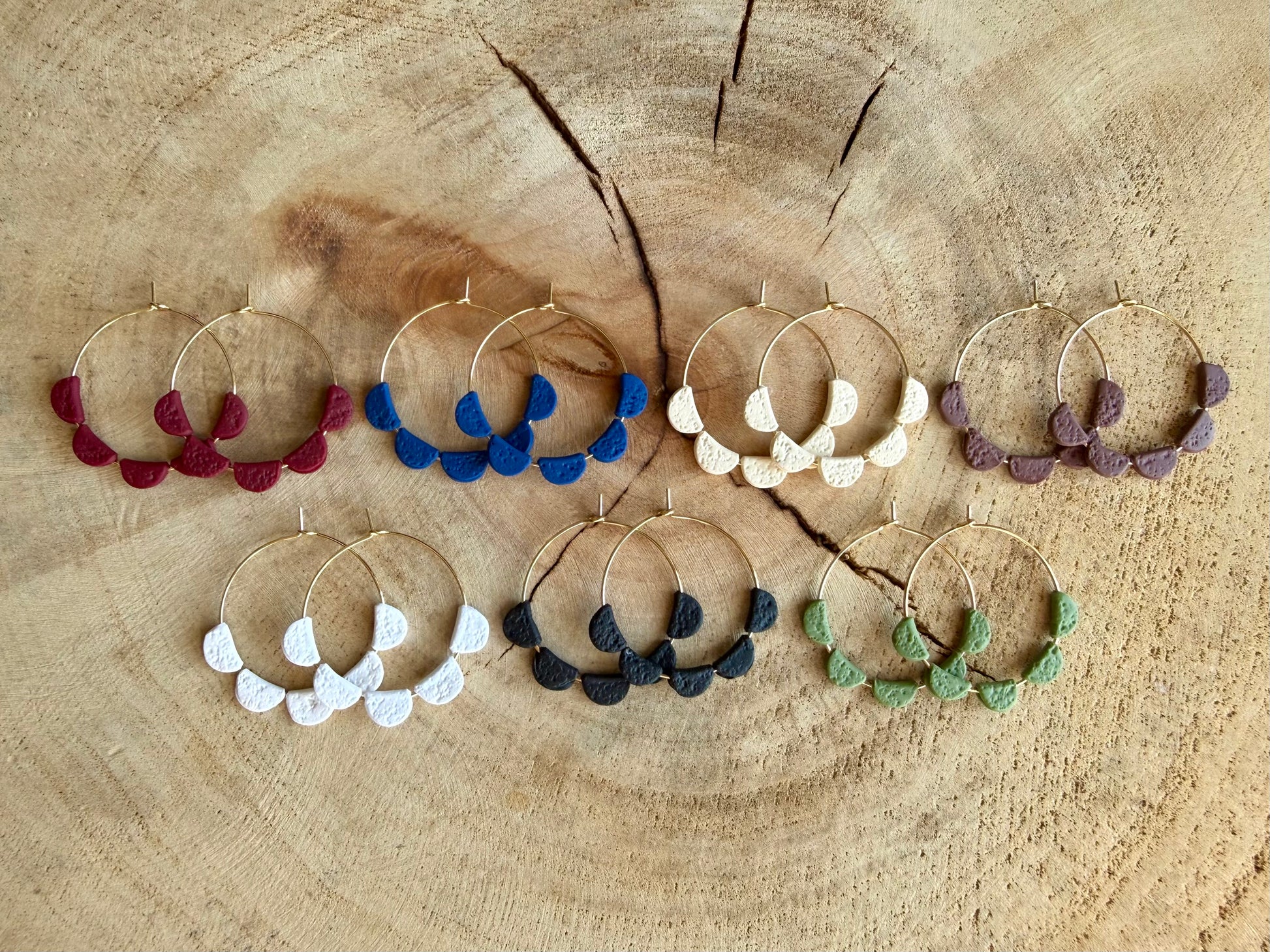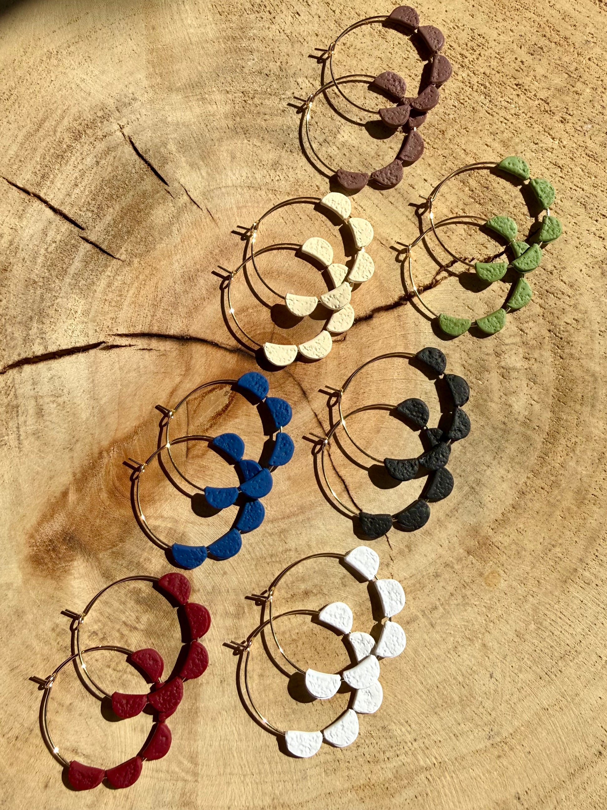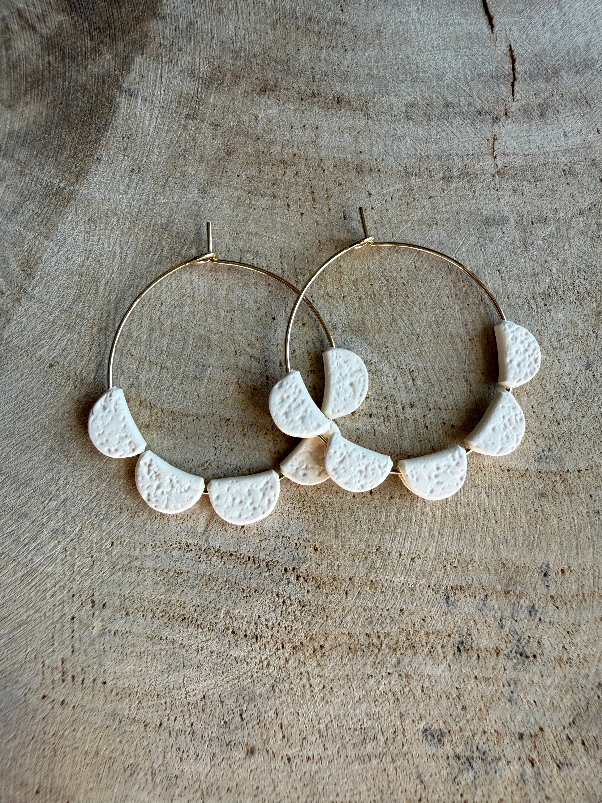 Meet your new everyday favorites: the Scalloped Josie Clay Hoops! These earrings blend modern simplicity with handcrafted texture, featuring delicate scalloped polymer clay charms on sleek gold hoops. Each pair is hand-formed and textured for a subtle artisan finish, giving them a unique look that complements any outfit.