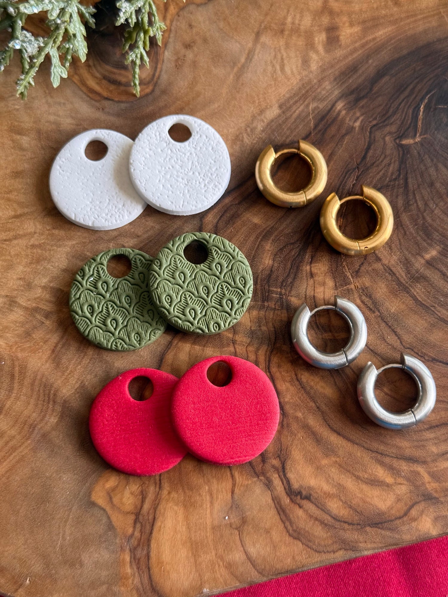 These MINI festive interchangeable polymer clay CHUNKY hoop earrings are the perfect mix of creativity, color, and holiday cheer! The set includes three pairs of handcrafted clay charms: one in snowy textured white, one in rich embossed olive green with a folk-inspired pattern, and one in velvety red. Designed to pair beautifully with either gold or silver hoops.
