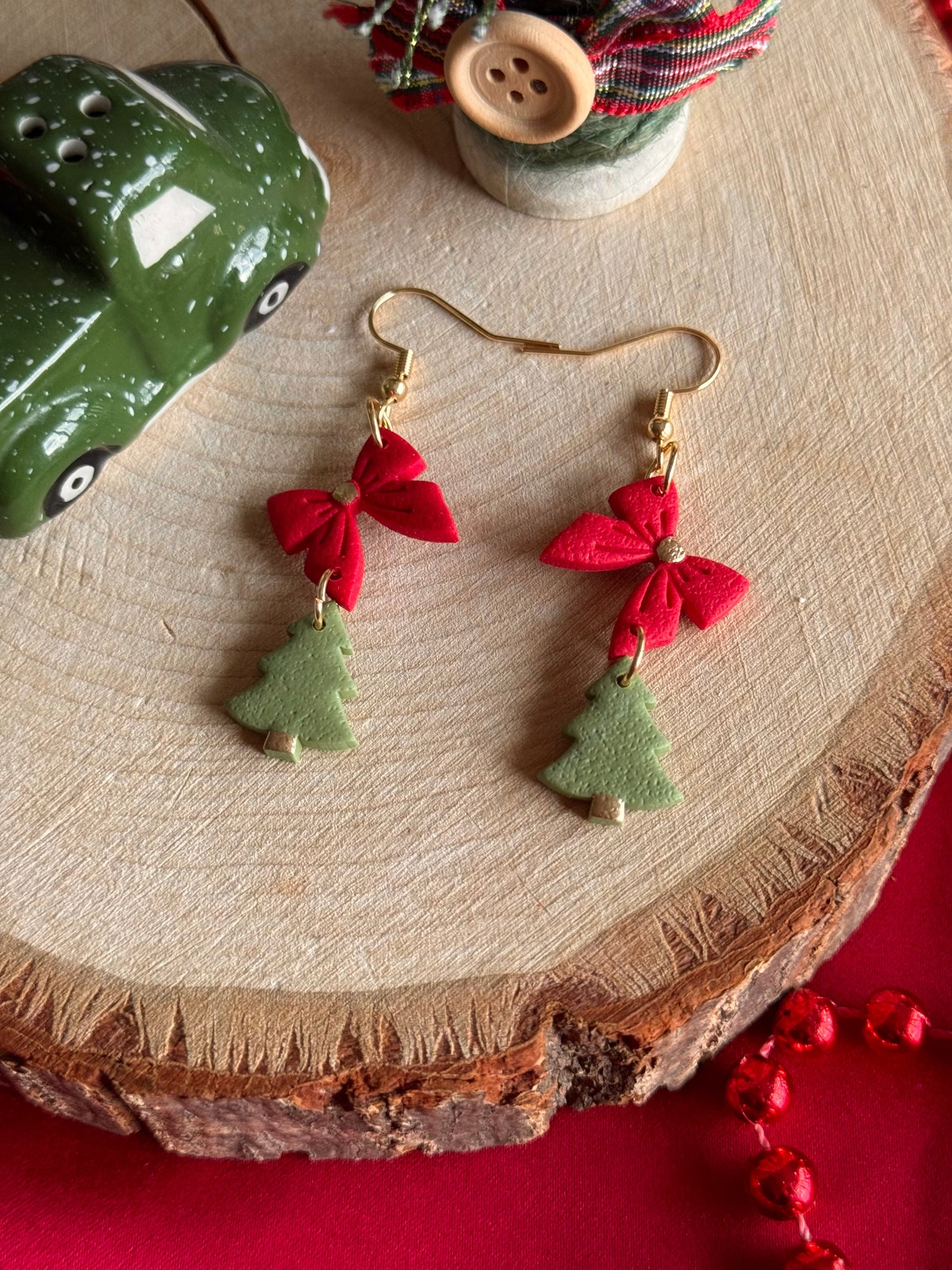 Bring festive cheer to any outfit with Ribbon & Pine! These handcrafted clay earrings feature a bright red bow at the top, paired with a tiny green Christmas tree that dangles playfully below. Lightweight and charming, they add a whimsical touch of holiday spirit to your look, perfect for seasonal parties or spreading cheer every day.