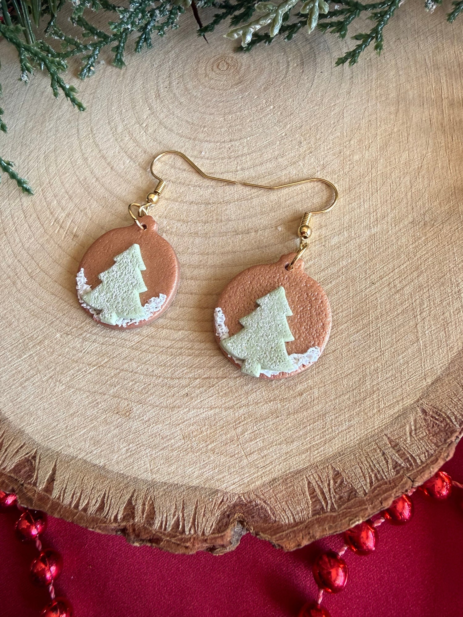 These handmade polymer clay earrings are inspired by Christmas ornaments, featuring a delicate green Christmas tree set against a shimmering rose gold background. Lightweight and carefully crafted, they capture the magic of the season in a stylish, wearable design. Perfect for holiday parties, gift-giving, or simply spreading cheer wherever you go!