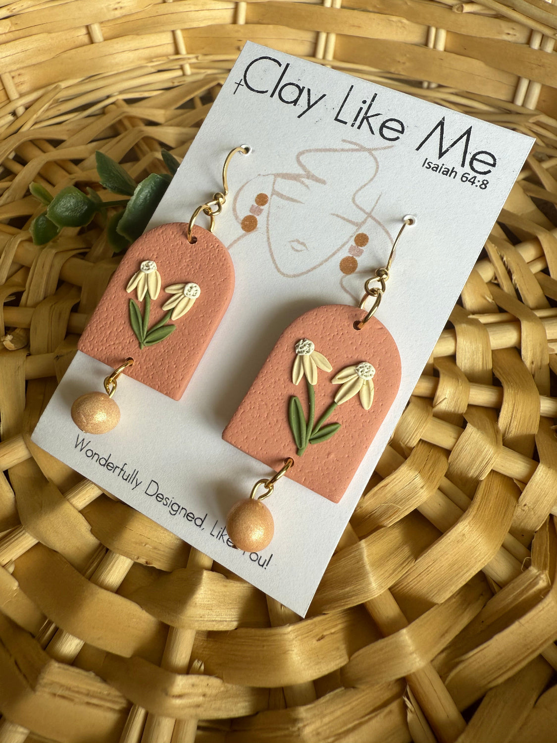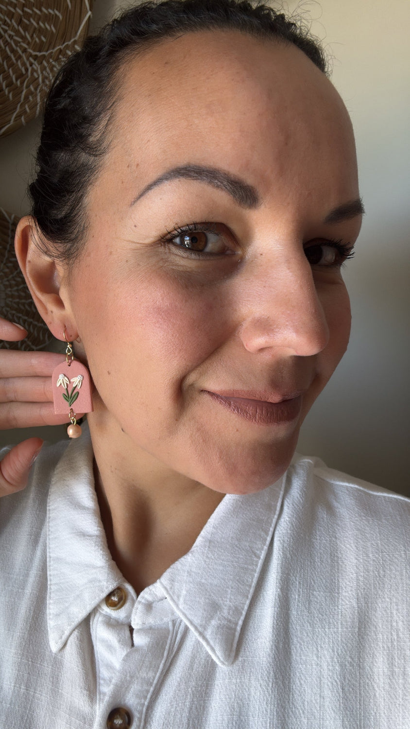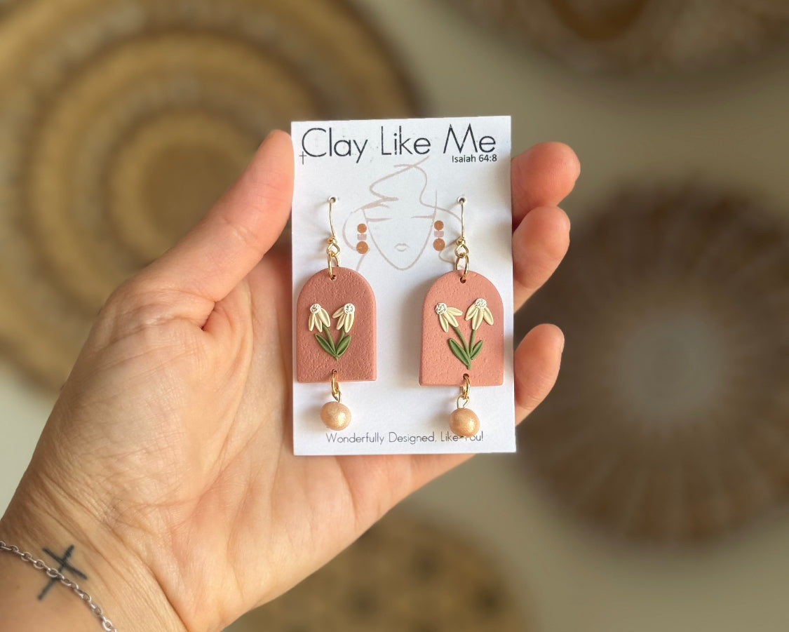 Detailed floral clay earrings with a handmade clay pearl gently rolled in mica powder. Every pair is made by hand, embracing small, intentional imperfections that give each piece its own soul and character. Lightweight and versatile, they’re perfect for everyday wear, special moments, and everything in between.