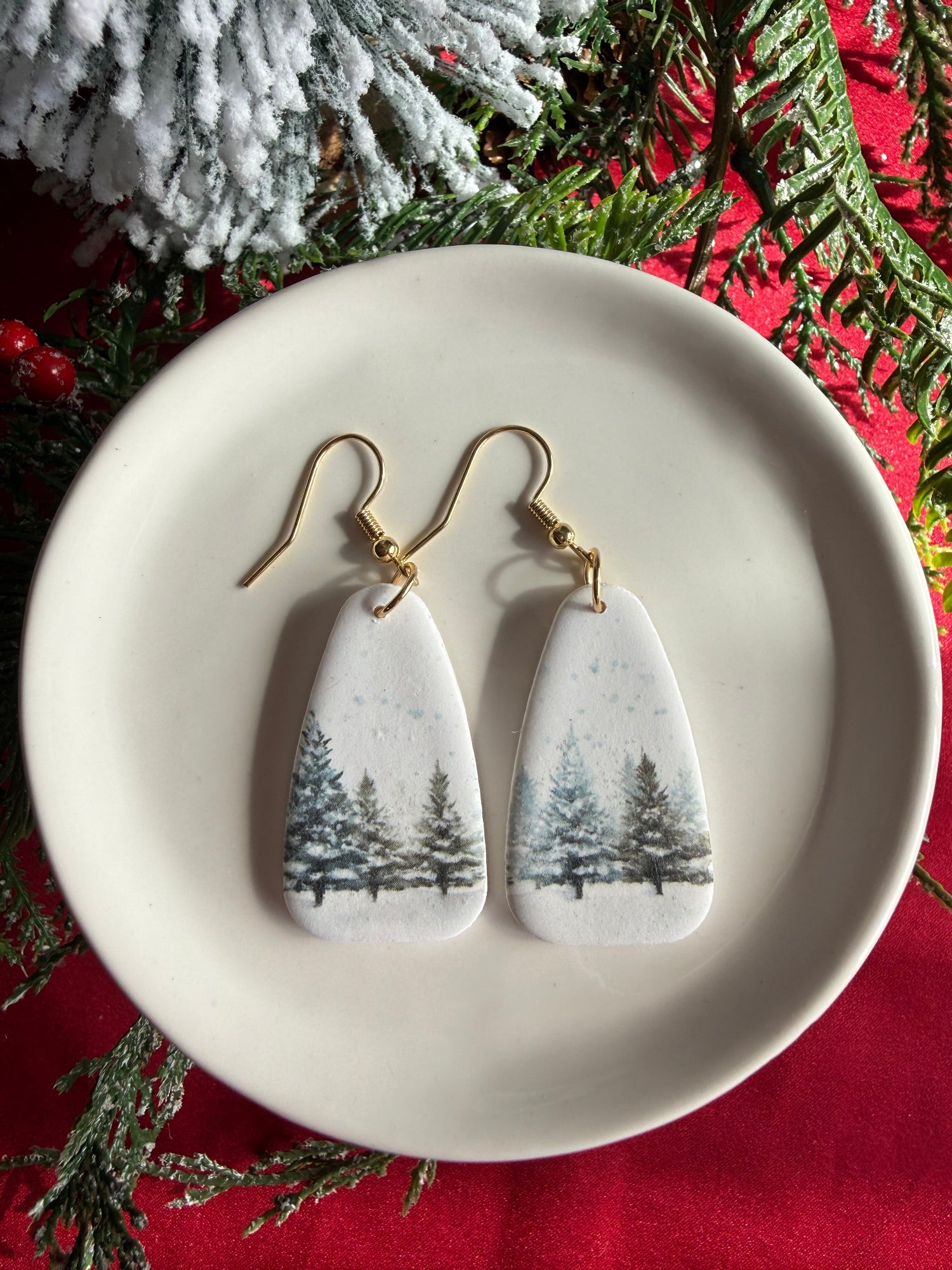 Step into a peaceful winter scene with this serene forest design. Each pair captures the quiet beauty of snow-dusted evergreens. A gentle reminder to pause, breathe, and find stillness in the season. Paired with a warm wooden accent ring that adds a natural, earthy touch.