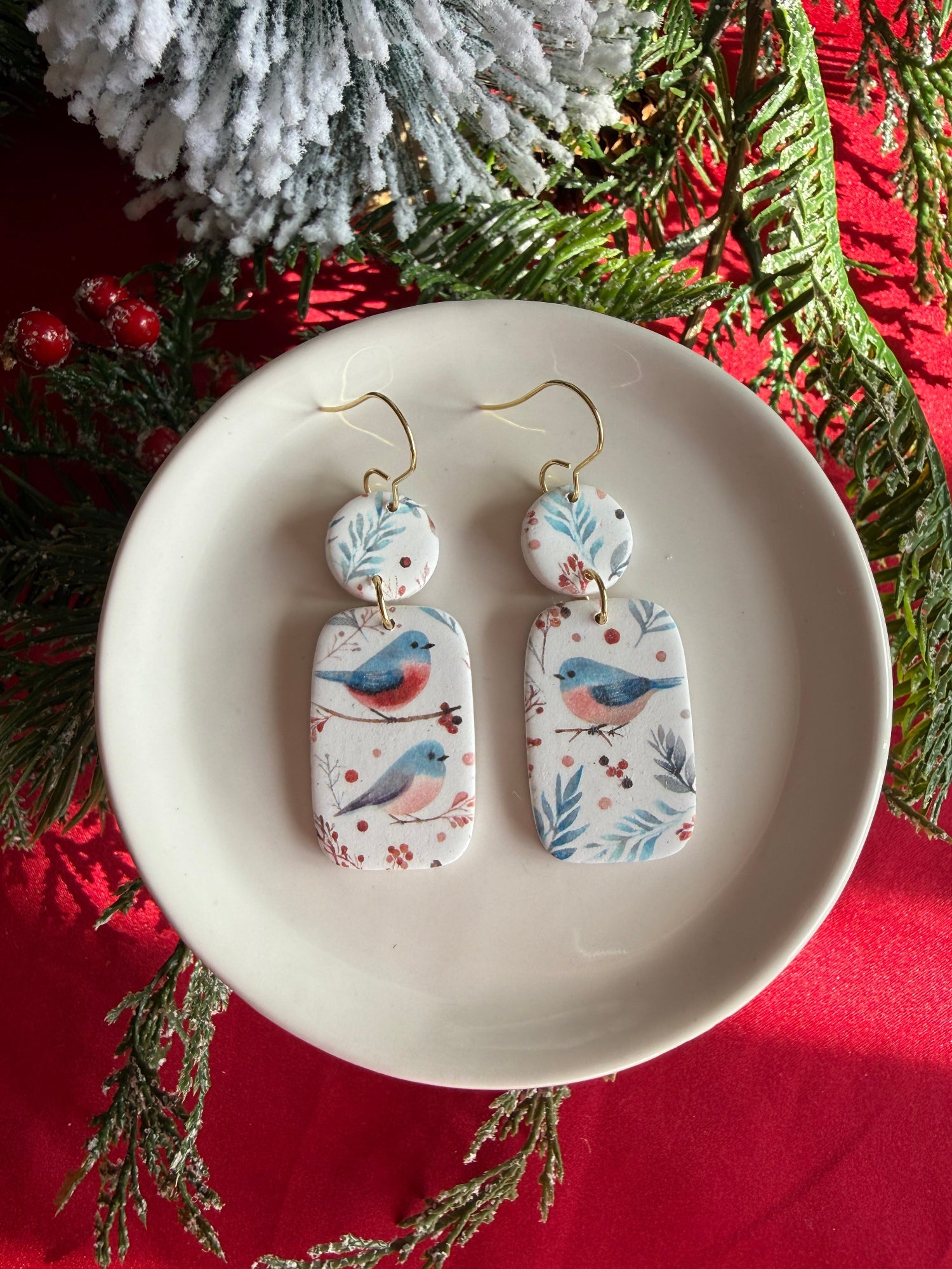 Peaceful and full of gentle beauty, these earrings feature a charming winter bird design surrounded by delicate branches and leaves. The soft hues of blue and blush, evoke a calm, frosty morning filled with quiet song and simple joy.