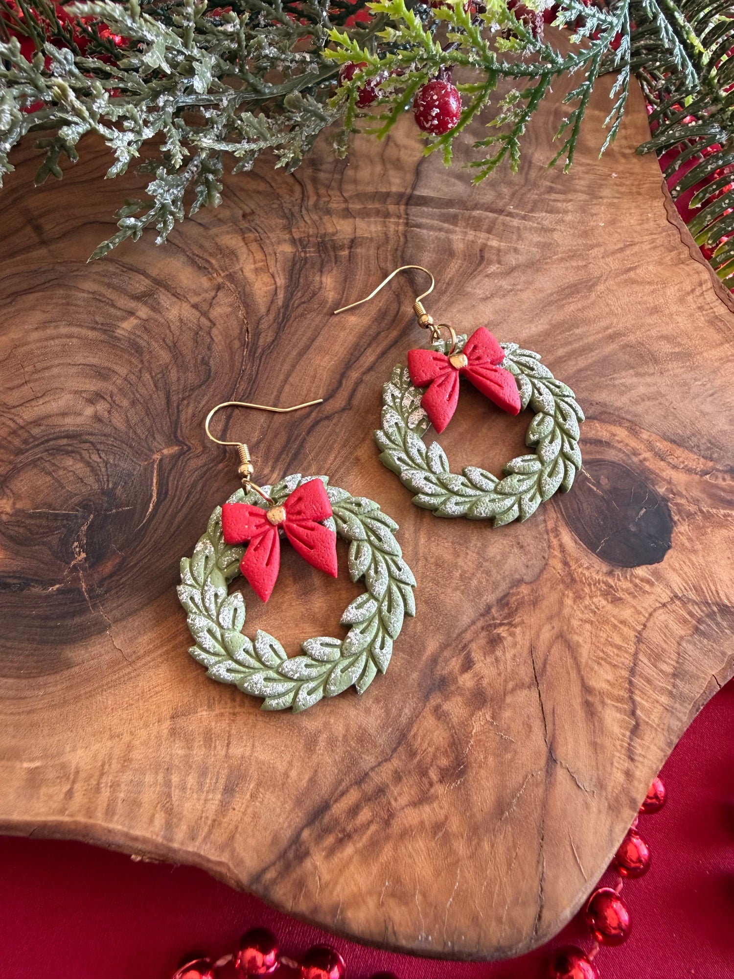 Celebrate the season with my handcrafted wreath earrings, a perfect blend of festive charm and holiday cheer. Each pair features a miniature green wreath, dabbed with white paint and adorned with a bright red bow, capturing the warmth and joy of Christmas in a wearable form.